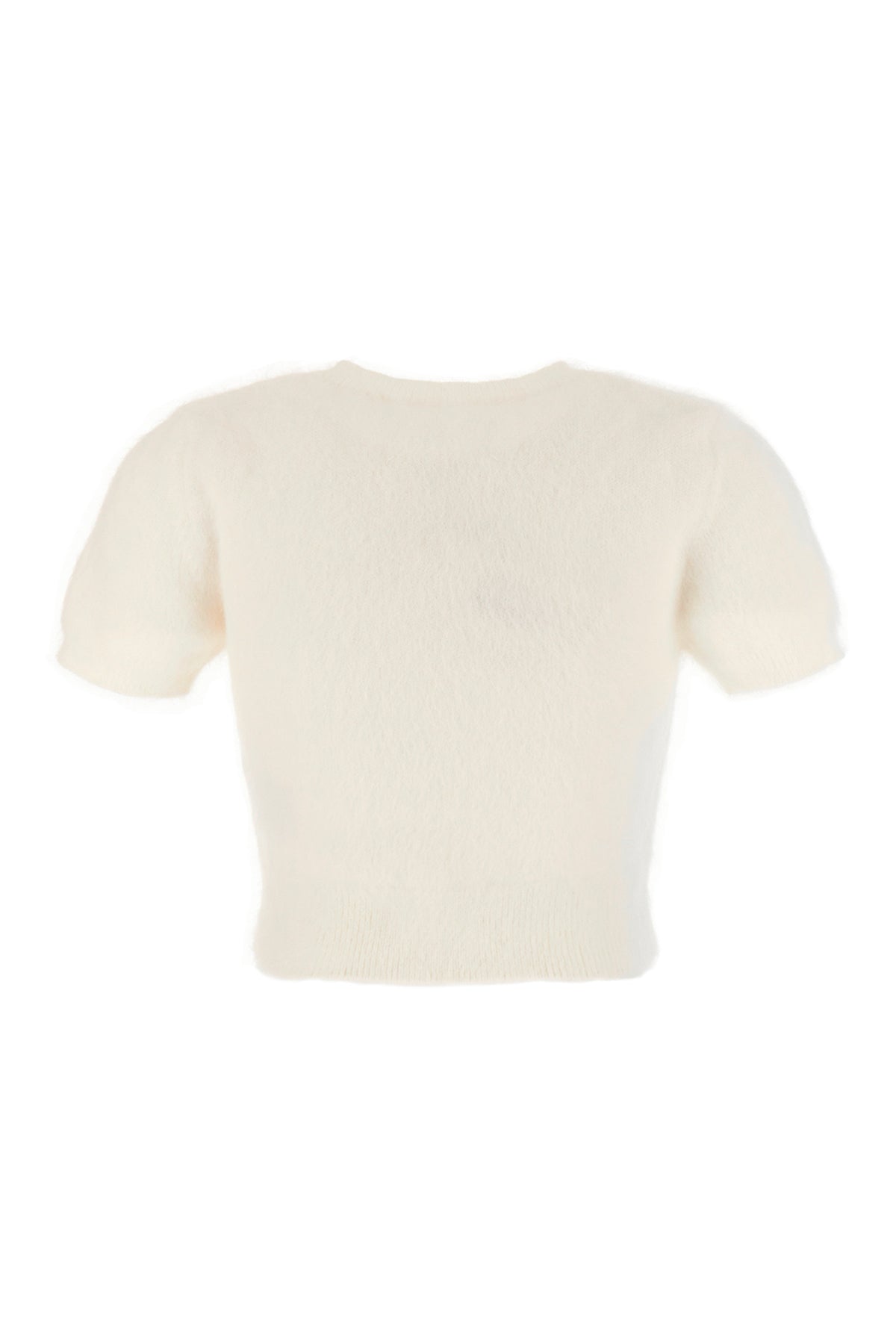 Sweater realized in angora blend characterized by iconic tonal embroidery at the back.