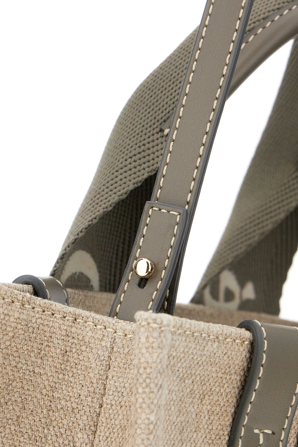 Handbag realized in linen enriched by Woody ribbon and contrasting leather inserts.