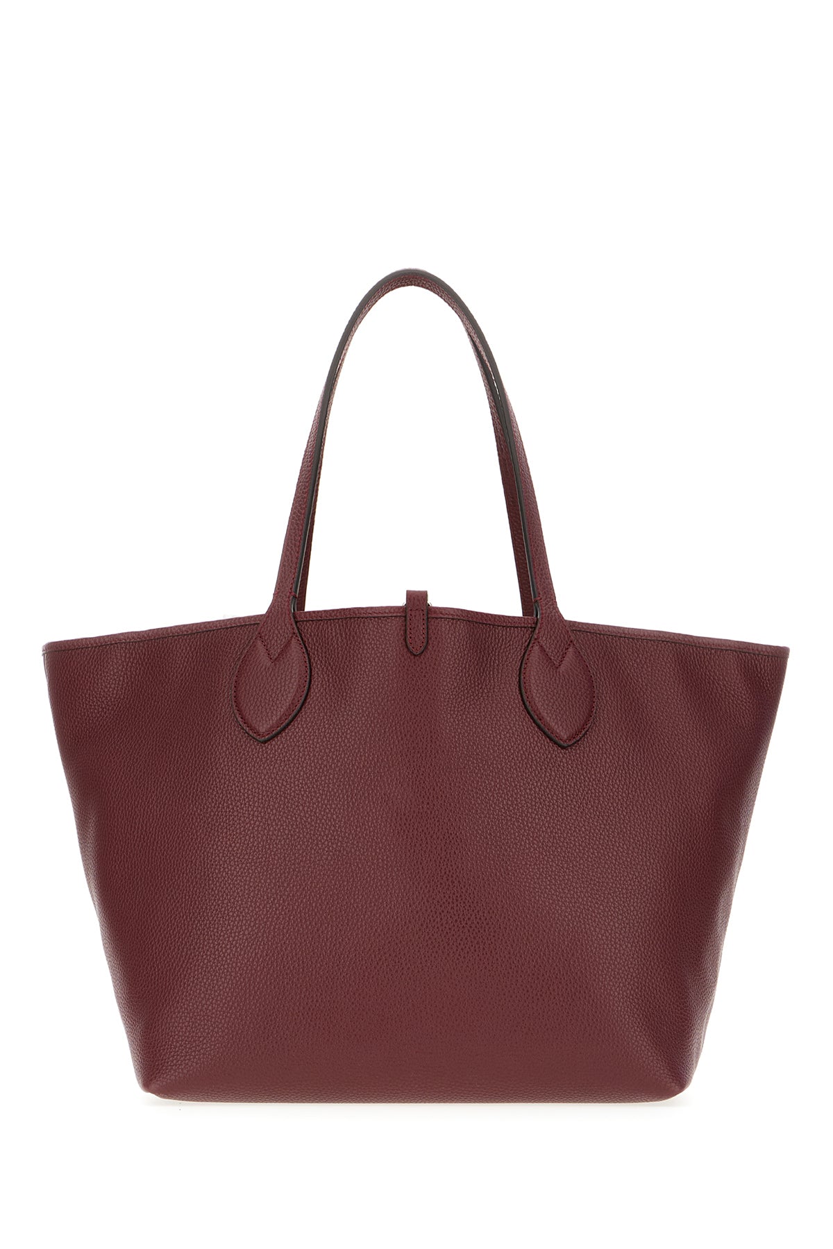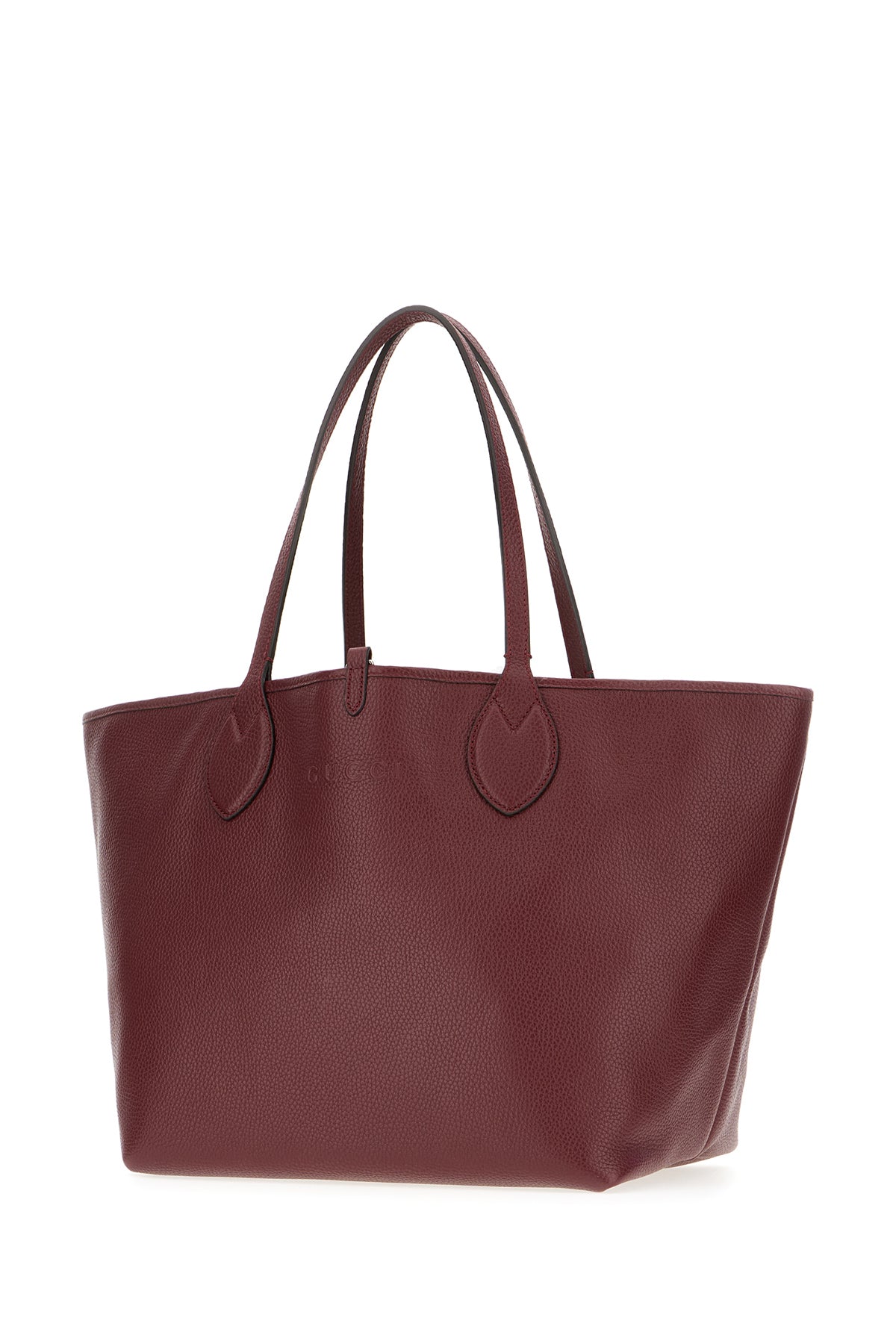 Reversible shopping bag realized in pebble leather characterized by logo in relief at the front.