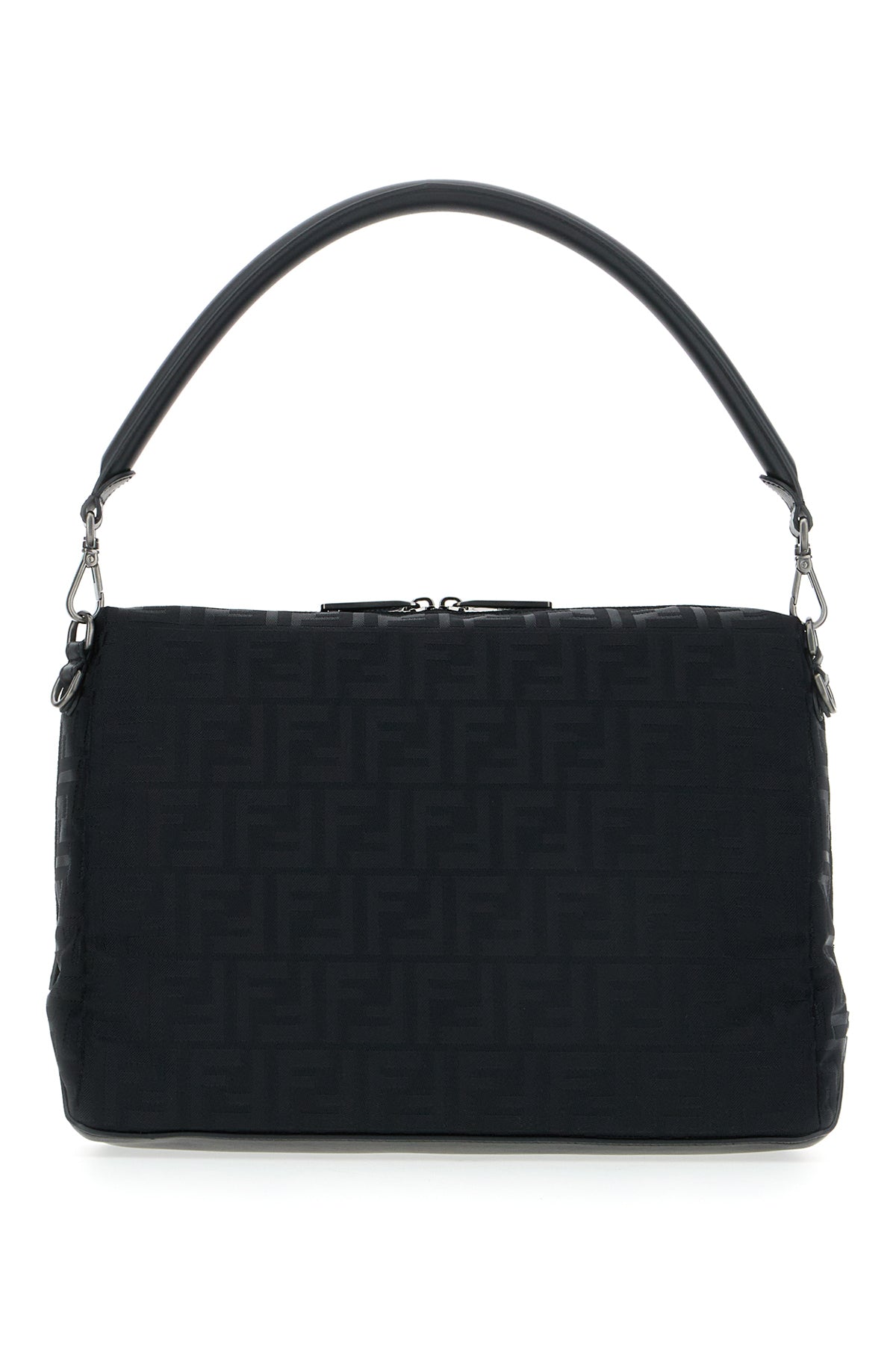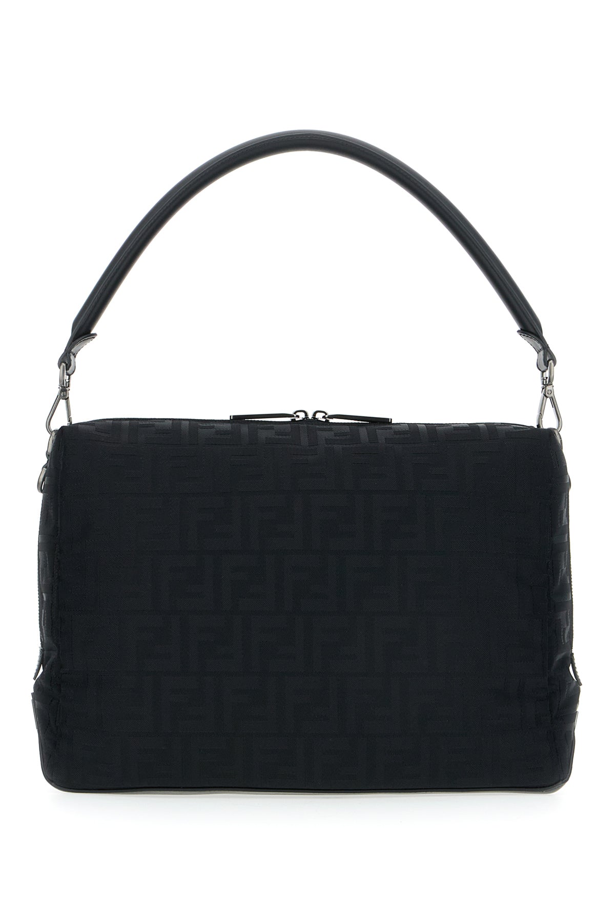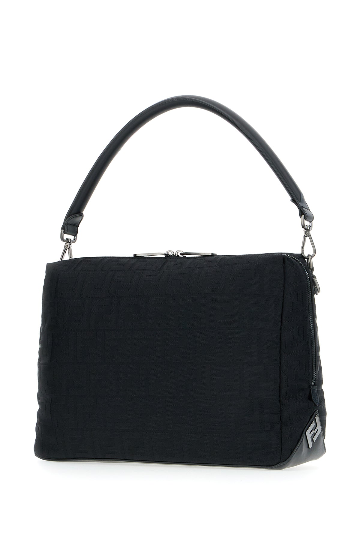 Handbag realized in nylon with smooth calf leather inserts characterized by FF motif embroidery on the entire surface enriched by metal FF detail on the side.