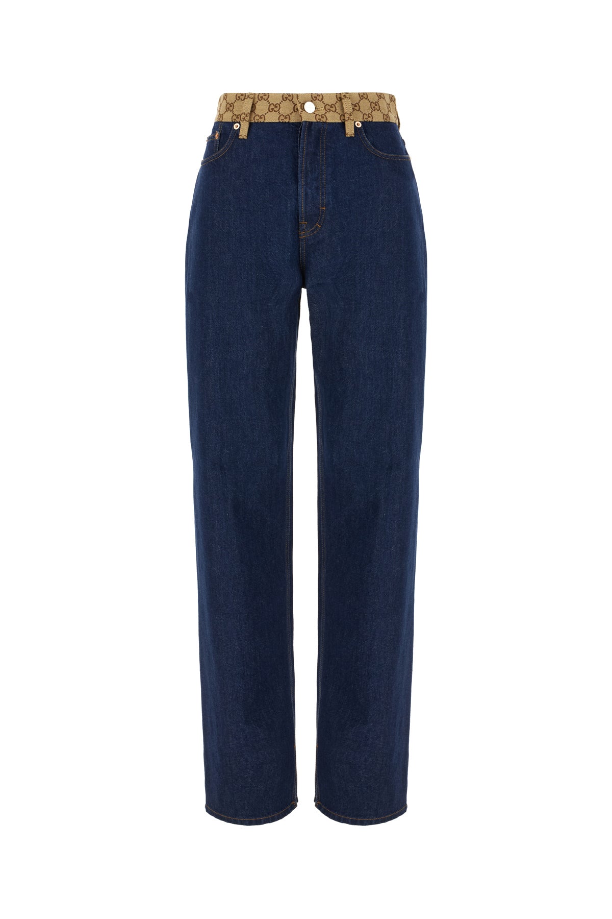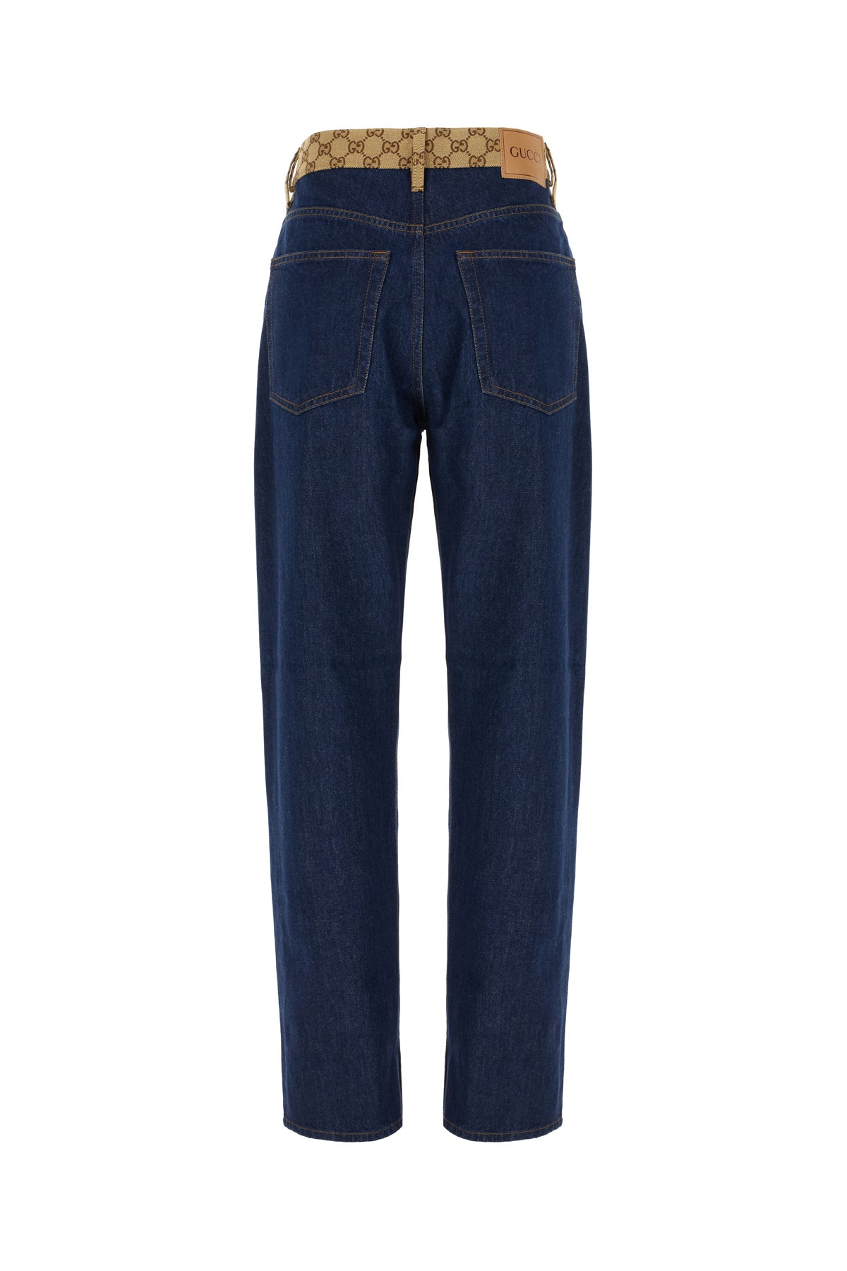 Jeans realized in pure cotton denim enriched by contrasting fabric insert at the waist contrasting logoed leather label at the back.