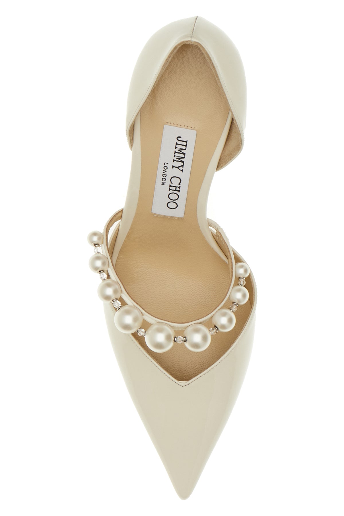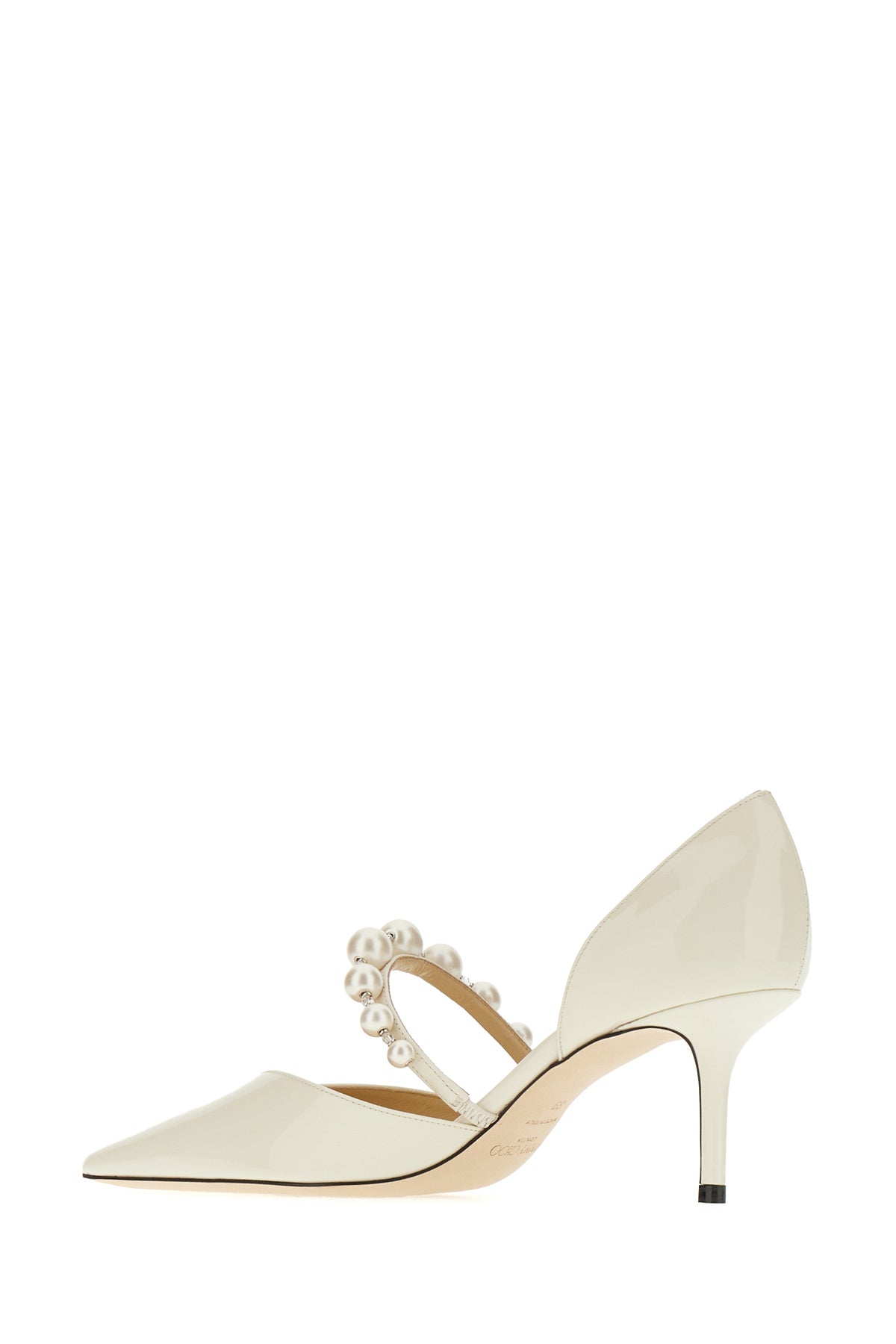 Pumps realized in patent leather enriched by strap with pearls.