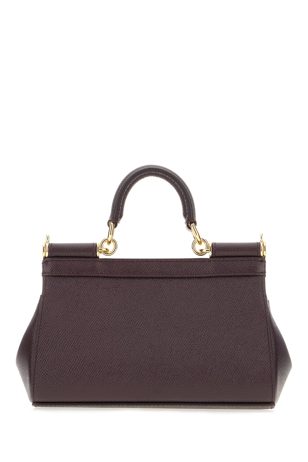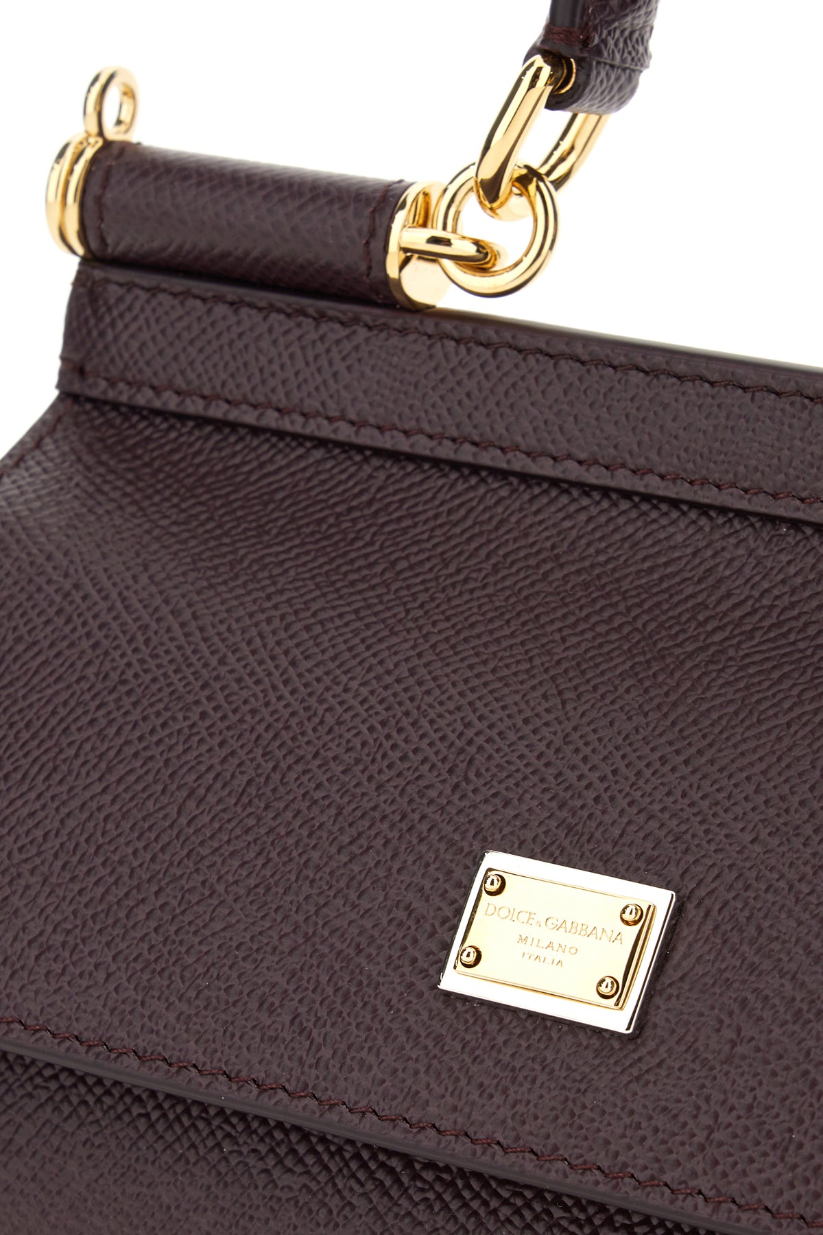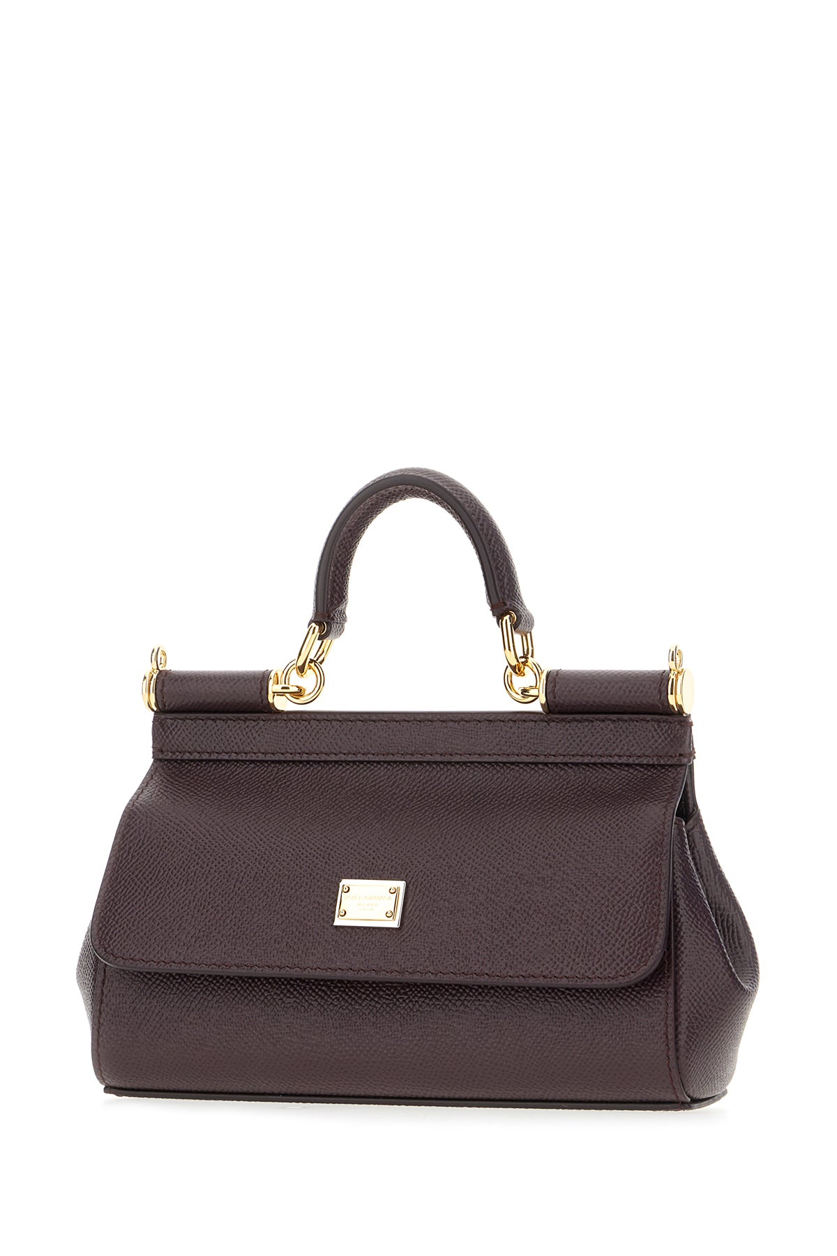 Handbag created grained calf leather enriched by metal logoed plate at the front.
