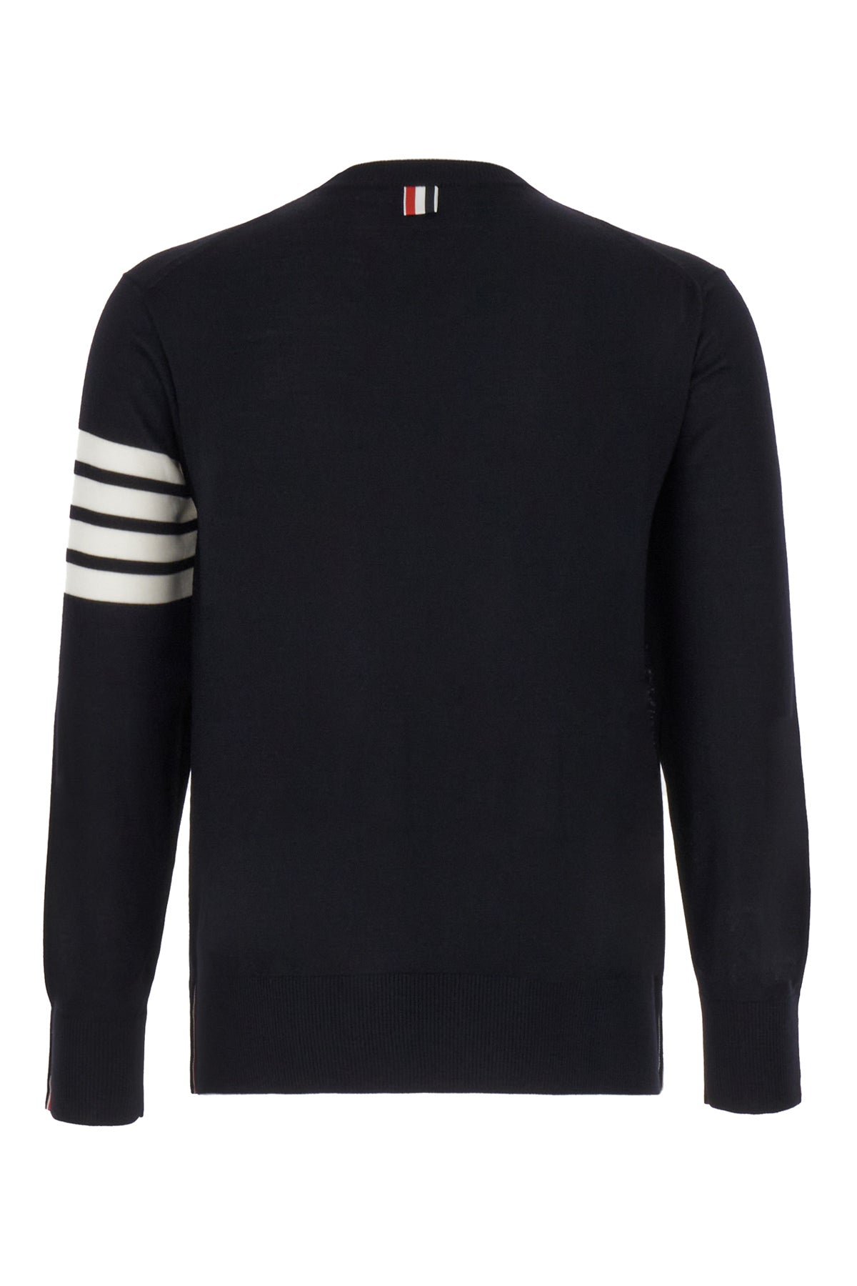 Maglione realizzato in pura lana vergine caratterizzato da ricamo a righe a contrasto sulla manica arricchito da iconica etichetta tricolore sul retro.